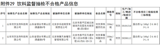 抽检公告显示,标称山东初饮生物科技有限公司(以下简称“山东初饮公司”)生产、北京多乐滋商贸有限责任公司经营的“初饮”原味酸奶饮品(280ml/瓶,2019-12-16),蛋白质检出值为0.9g/100g,而标准值为≥1g/100g。