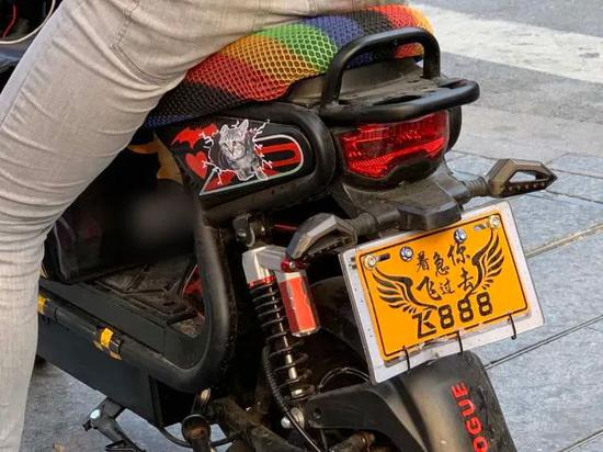 小袁说自己热爱外卖这份工作,他的电动车酷炫得有些跳脱,座位上是彩虹色的套,车身有一个特别朋克的猫咪贴纸,轮子在夜里会发出彩色的霓虹光,车尾的牌子上写着“着急你飞过去”。小袁也会时不时打理一下他被头盔压扁的飞机头,保持帅气。