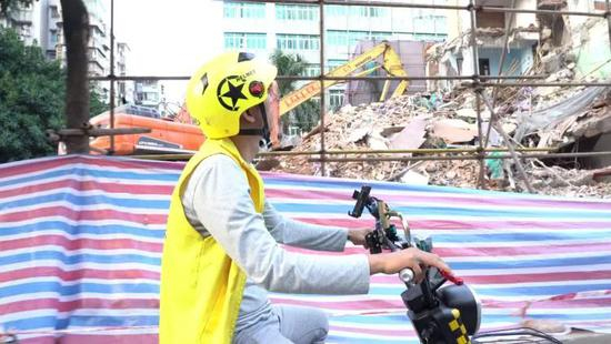 送餐的路上,小袁喜欢去“看”这座城市的一举一动。/摄影:孔大吉