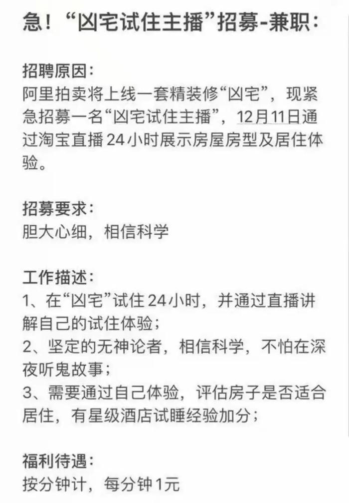 为了给这次拍卖引流,阿里方面启动了“凶宅试住主播”的招聘,薪资1分钟1元,应聘者不仅要完成在该宅的一晚试睡,还要做24小时直播,播给广大网友看。