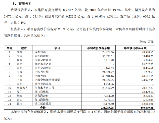 2019年报告期末,万科为项目存货跌价准备为 29.9 亿元,公司基于审慎的市场策略,对仍存在风险的项目计提存货跌价准备。而计提的存货减值准备,影响其2019年净利润11.4亿元。