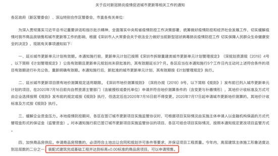 为了缓解企业资金压力、加快商品房供应等原因,4月16日,深圳住建局发布《关于应对新冠肺炎疫情促进城市更新等相关工作的通知》,对商品房预售条件放宽,高层建筑主体施工形象进度达到总层数的二分之一、装配式建筑完成基础工程并达到标高±0.00标准(即基础施工完成,施工到地面)的商品房项目,可以申请预售。