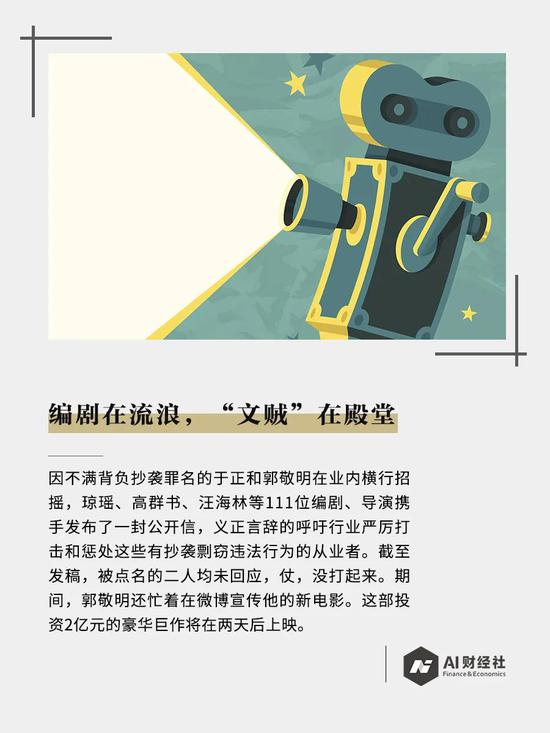 12月21日晚间,编剧余飞、宋方金等人在微博发出了一封联名信,111位编剧、导演、制片人、作家联名“上书”,将矛头对准近期活跃于各大综艺平台的郭敬明和于正。信件字句铿锵地痛斥道:郭、于二人过去有抄袭劣迹,这样的“文贼”在网络平台、电视台,被捧为导师,让他们贩卖“成功学”,提供话题炒作,满足平台对点击率、收视率的追逐。