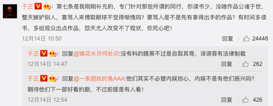 在联名信发布不久前,汪海林在微博上已经和于正展开了较量。12月13日,谭飞、汪海林在微博上“内涵”于正是抄袭者,抨击其过去存在行贿行为;于正则揶揄汪海林没有一部拿得出手的作品,并称谭、汪两人是“一汪臭潭”。