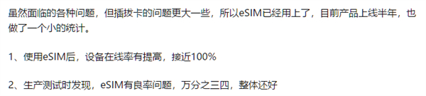 然而在今年使用了 eSIM 的方案之后,设备的网络稳定性提高了不少,额外的流量支出也没了。