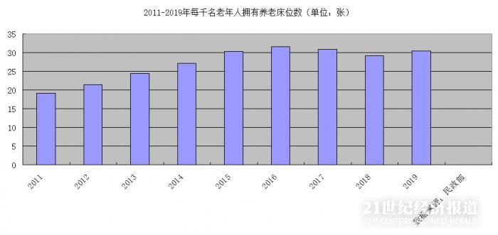 然而,随后养老床位的发展陷入相对缓慢的状态。2016年,每千名老年人拥有养老床位31.6张;2017年,每千名老年人拥有养老床位30.9张;2018年,每千名老年人拥有养老床位29.1张;2019年,每千名老年人拥有养老床位30.5张。