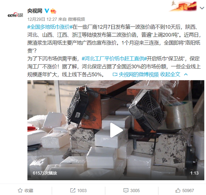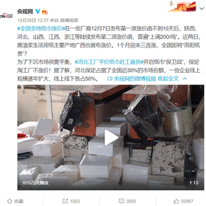 据央视网消息,受木浆价格上涨影响,12月以来,生活用纸涨价潮继续蔓延。