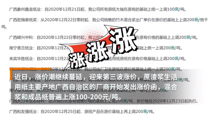 在一些厂商12月7日发布第一波涨价函不到10天后,陕西、河北、山西、江西、浙江等陆续发布第二波涨价函,普遍“上调200/吨”。近两日,蔗渣浆生活用纸主要产地广西也宣布涨价。