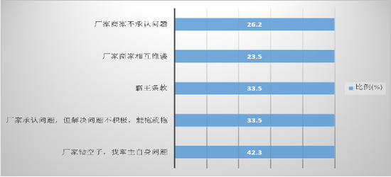 解决投诉过程中出现较多的情况是:“厂家钻空子,找车主自身问题”,占42.3%;其次是“厂家承认问题,但解决问题不积极,能拖就拖”和商家“霸王条款”成为处理的障碍,两者均占33.5%;“厂家商家相互推诿”和“厂家商家不承认问题”,分别占23.5%和26.2%。