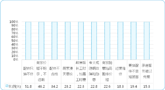 51.8%受访车主认为“配件只换不修,无形中增加了费用”;46.2%受访车主认为“商家价格不明示、不透明”;认为“配件不合格”的占34.2%”。