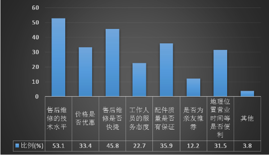 “工作人员的服务态度”和“是否为亲友推荐”及其他,占比率分别为22.7%、12.2%和3.8%。(由于该项调查为多选项,大部分受访车主选择维修时一般会考虑多项因素。)