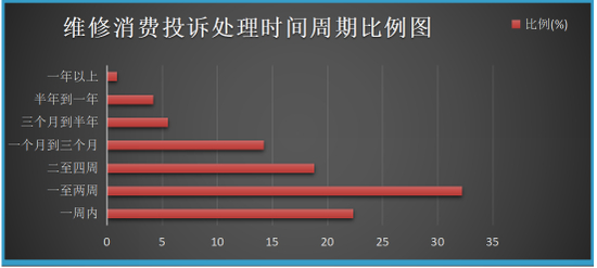 在汽车维修投诉纠纷方面,调查显示,从商家受理投诉到妥善处理,“一周内”解决的占22.3%,“一至两周”的占32.2%,两者合计占55.5%。
