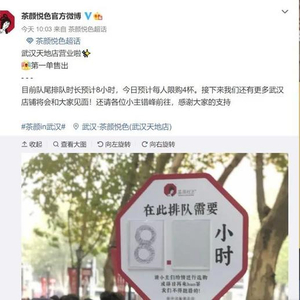 “11点半开始排队,12点50排到点单那里,12点58拿到奶茶……”2021年1月10日,排队一个多小时后,微博网友“暖暖恹恹足够了”在茶颜悦色武汉天地店终于买到了心心念念的奶茶。