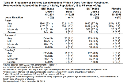 发烧方面,有15.8%的人在两剂量疫苗后出现了发烧。(这里的发烧定义是38度以上,按中国的定义其实已经是高烧了),其中1.2%的人出现了39度及以上的高烧。