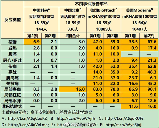 微博上某大V发过一张不同疫苗不良反应发生率的比较。很明显,中国的灭活疫苗,基本上没有什么统计上显著的不良反应,而两款mRNA疫苗出现了很明显的不良反应。