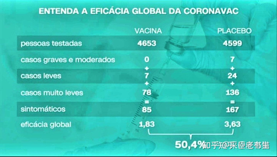 2021年1月13日,科兴疫苗境外合作机构巴西布坦坦(Butantan)研究所公布了科兴疫苗Ⅲ期临床试验的最新数据:科兴疫苗的总体有效率(general efficacy)为50.38%。然而,几天前,1月7日,布坦坦研究所公布的科兴疫苗保护率是78%。同样是科兴疫苗,2020年12月,土耳其统计的保护率的91%。