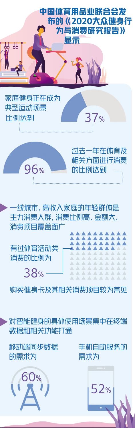看两个报告:运动科技公司Keep发布的《2020Keep大数据盘点》年度运动报告显示,共有累计超过5650万名用户在相关活动期间加入居家运动的行列;中国体育用品业联合会发布的《2020大众健身行为与消费研究报告》指出,家庭健身正在成为典型运动场景,比例达到37%;过往一年在体育及相关方面进行消费的比例达到96%,人均超过4000元;新冠肺炎疫情倒逼大众健身意识全面加强,疫情期间持续保持健身参与率达到93%,体育用品消费率达到65%,平均消费金额1972元。