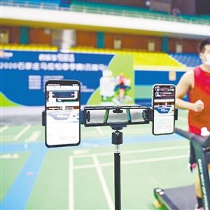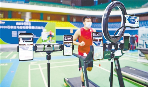 新冠肺炎疫情期间,健身软件帮助人们实现了居家期间的健身需求,许多赛事也改为线上方式进行。图为2020年在河北省石家庄市举行的一场线上马拉松比赛开幕式上,健身教练通过直播设备带领参赛选手进行赛前热身。参赛者可以使用任意记录跑步数据的应用程序(APP)完成比赛,并上传成绩截图。 张晓峰摄(新华社发)