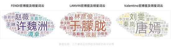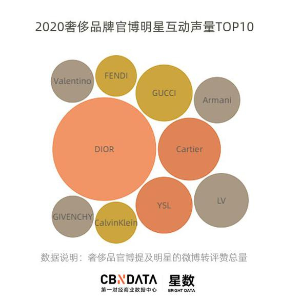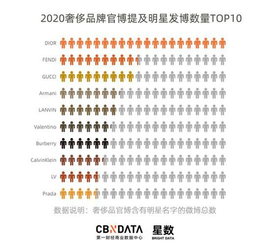 据CBNData星数统计,2020年奢侈品牌微博提及明星数量TOP10中,FENDI、LANVIN和Valentino 也都纷纷上榜,提及量均在200条以上。