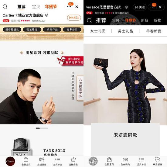 2020年,有更多高奢品牌开始瞄准国内电商平台。卡地亚开年在天猫旗舰店进行全球新品首发,Prada、Versace、GUCCI陆续开设天猫官方店铺,全球知名的奢侈品购物平台farfetch在2021年初宣布入驻天猫国际……在跟电商牵手的同时,他们也有意识的在店铺内放置明星宣传物料。