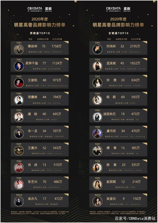 CBNData星数从大数据的角度,对2020年明星与奢侈品合作的影响力效果进行了实际评估。