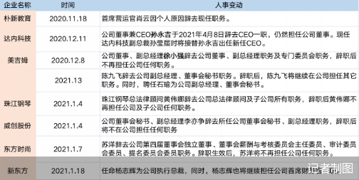 据北京商报记者不完全统计,短短三个月内,发生在教培行业内部的人事任免就超过10起。以达内科技为例,根据其发布的公告显示,公司董事兼CEO孙永吉因个人原因,将于2021年4月8日辞去CEO一职,届时将由达内科技副总裁孙莹接任。而这并不是达内科技近期的第一次高管变动,2020年4月,达内科技创始人韩少云辞去了CEO职位,CFO杨余多离职。值得注意的是,达内科技董事会于去年12月收到了私有化要约,一旦完成私有化,达内科技或将从纳斯达克交易所完成退市。