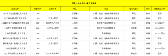 企查查显示,目前郑爽名下共有9家关联企业,其中7家集中于影视文化产业,均为“广播、电视、电影和录音制作业”“商务服务业”等范畴。