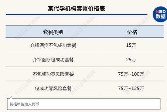 《每日经济新闻》记者也了解到,代孕服务的风险和不确定性高,支付的费用也不菲。以国内一家排名靠前的网站为例,介绍医疗不包成功套餐收费15万元、包成功25万元(介绍套餐为客户有自己的代孕妈妈),零风险套餐的起步价达到75万元,包成功零风险的价格在75万-125万元之间。还有些网站则在这些常规套餐基础上增加了包性别、双胞胎包成功等套餐,对应的价格也会更高。