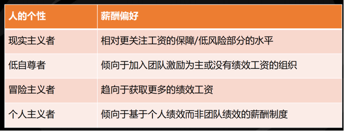 另外,我们要考虑到不同个性的员工对薪酬的风险度是有偏好的。现实主义者,他会相对保守,更关注工资的保障功能。低自尊者他会倾向于加入以团队激励为主的组织,他不觉得自己有很强的个体能力,所以会想躲在团队激励里减小压力。冒险主义者,他们倾向于更多的绩效工资,这种往往在销售中间会比较明显。个人主义者他会倾向于说要个人绩效,而不是团队绩效的情况。