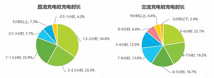 直流充电桩的平均充电时长为1小时54分钟,85%的用户可以在2.5小时内结束充电,而交流充电桩平均充电时长5小时45分钟,66.2%的用户需要5小时以上的冗长充电时间,这两者将近4小时的时长差距直接决定了车主最明显的使用偏向。