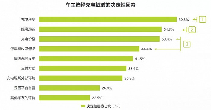 在艾瑞和QQ Survey对全国一、二线1034名电动私家车用户调研时,在选择充电桩的决定性因素中,充电速度成为吸引车主最直接的原因,60.8%的私家车主十分在意充电速度和效率。