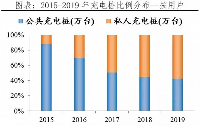 私人桩基本都是适合夜间长时间充电的交流桩,因而对公共慢充交流桩有极强的挤出效应。据《2019-2020年度中国充电基础设施发展年度报告》披露,我国公共充电桩从2015年5.78万台增加到2019年51.64万台,年复合增速72.89%,而私人充电桩从2015年0.80万台增加到2019年70.30万台,年复合增速206.17%,三倍于公共桩,占比也从2015年得12.16%大幅提升到2019年的57.67%,超越公共桩。