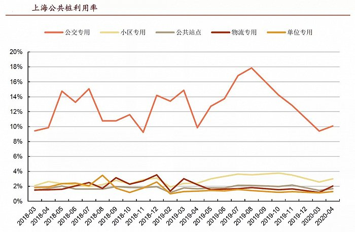 首先是因为补贴的偏向性而过度投资成本低充电慢的交流桩,而且过多地考虑了电力成本和场地资源,忽略了市场需求,导致充电桩利用率低,运营商不断亏损,下面的上海公共桩利用率可以看到,近几年除公交外的公共桩利用率基本在1%-3%之间,但是充电利用率一般需高于5%才有机会实现盈亏平衡;