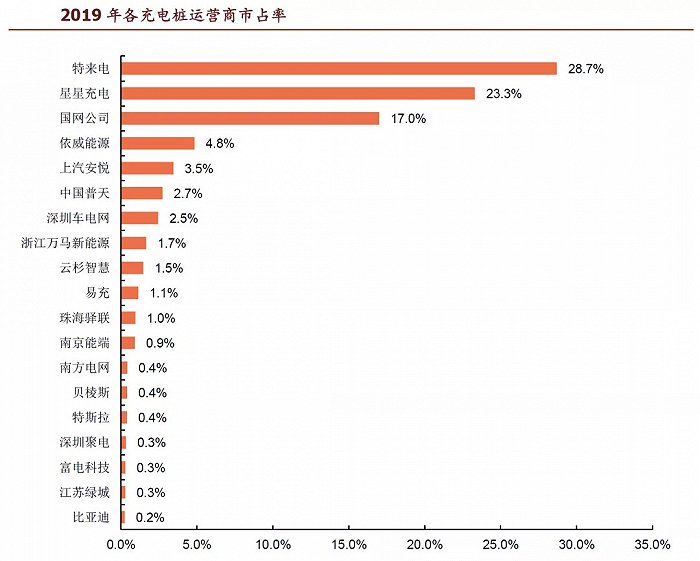 份额上民营企业特来电、星星充电和国资龙头国网公司居前三,截至2019年三家份额分别为28.7%、23.3%、17%,共计69%,保有量达35.6万台,拉开后面的企业一大截,行业集中度高。