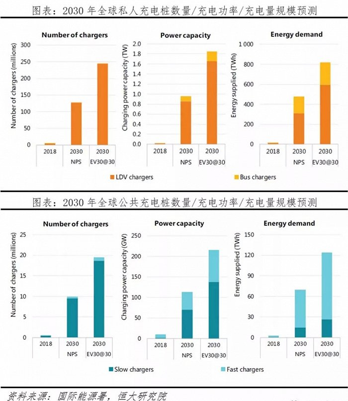 另外,从2019年国际能源署IEA发布《Global EV Outlook 2019》报告和恒大研究院任泽平的研究上看,到2030年全球私人充电桩预计保有量分别达到12800-24500万台,总充电功率达1000-1800GW,总充电量达480-820TWh;
