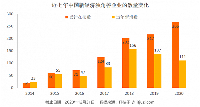 截止 2020 年 12 月,列入中国新经济独角兽俱乐部的企业数量达到了 266 家,较上年同比增加了 23%,也是近 7 年来的最高点,这亦可谓是新经济投资趋于成熟的重要表现。