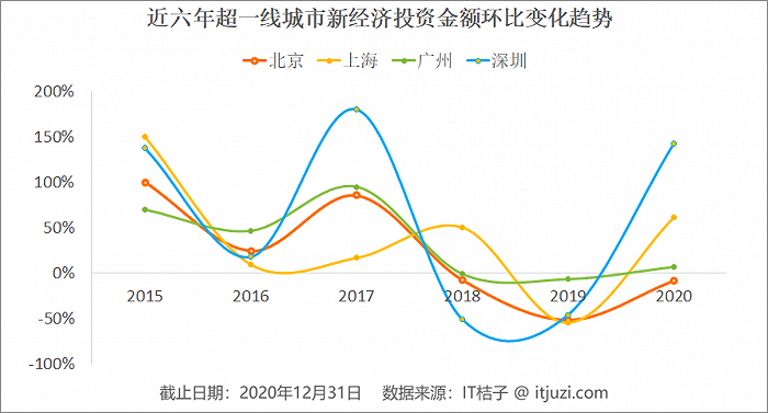 从上图来看,一线城市新经济股权投资金额变化整体趋势相对一致,2015~2017 年,北上广深的投资金额都在增长;2018 年除上海外其余都在下跌,2019 年继续更大地下跌,到 2020 年又出现了分化:北京的新经济股权投资额有所下降,广州与去年基本持平,而上海和深圳意外迎来了高增长之势,尤其是深圳,涨幅高达 143%。到底是哪些事件促使的呢?
