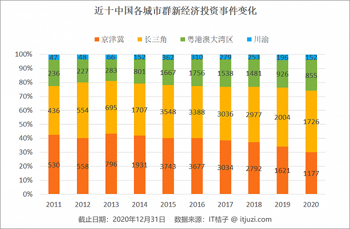 从上图可以看出,历年来新经济投资事件都集中在以北京为中心辐射的京津冀区域和以上海为中心辐射的长三角区域,这两大区域的投融资交易合计占比持续稳定在 70%-80%,甚至一度曾突破过 80%。