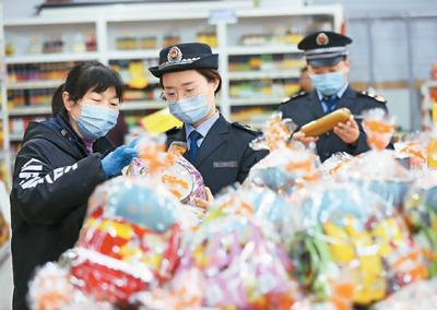 春节临近,安徽省淮北市烈山区市场监管部门针对节日消费量大的食品、卫生用品、保健用品等重点商品,加强监督抽查和执法检查。 李鑫摄(人民视觉)