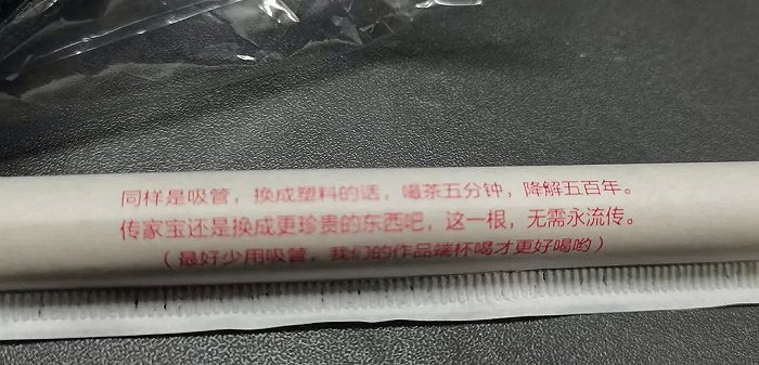 “同样是吸管,换成塑料的话,嘬茶五分钟 ,降解五百年。传家宝还是换成更珍贵的东西吧,这一根,无需永流传。”