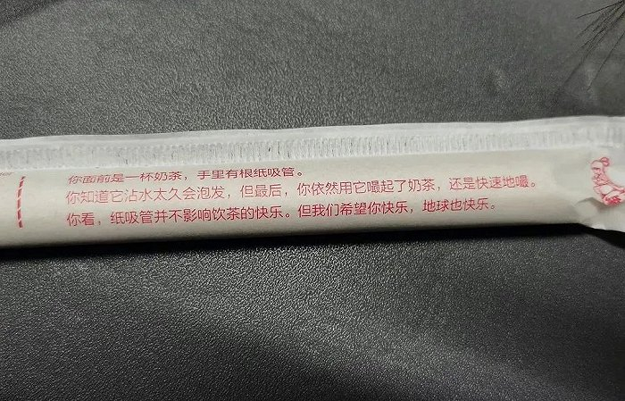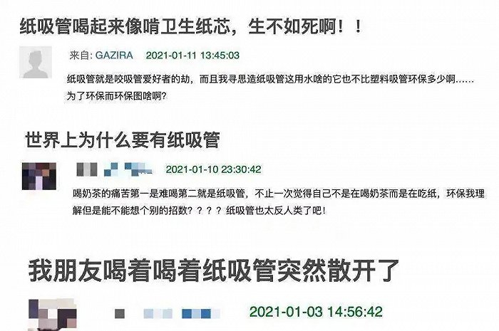 纸吸管被形容为“喝起来像啃卫生纸芯,生不如死”、“喝奶茶的痛苦第一是难喝,第二就是纸吸管”、“喝着喝着纸吸管突然散开了”……