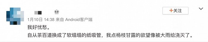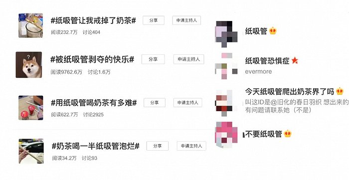 微博上,#纸吸管让我戒掉了奶茶#、#被纸吸管剥夺的快乐#、#奶茶喝一半纸吸管泡烂#之类的话题就没断过。