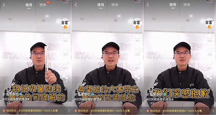 “古茗门店近期开始,将纸吸管陆续更换为可降解、更好戳的PLA吸管。给您造成的不便我们深感抱歉。”视频中,古茗一位研发负责人郑重地向消费者道歉,诚意满满。