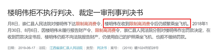 比如江西省崇仁县人民法院2019年6月发布的判决书显示,崇仁县人民法院对楼明伟下达限制高消费令,楼明伟在收到限制高消费令后仍频繁乘坐飞机。