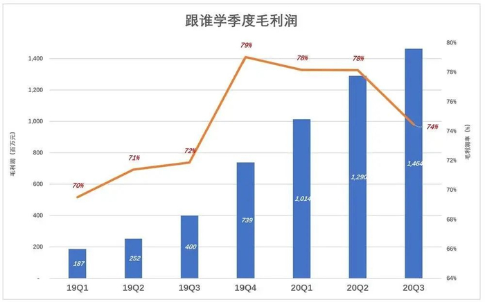 2020年Q1,跟谁学毛利润率78.2%,领先好未来25.3个百分点,但58.4%的市场费用率比好未来高34.3个百分点,“输”了9个百分点;2020年Q2跟谁学毛利润率领先25.5个百分点,但市场费用率暴涨至73%,“输”了13个百分点(注:由于财季截止日差一个月,无法精确比较)。