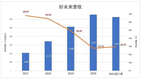 2017财年(2016年3月1日至2017年2月28日),好未来营收突破10亿美元,同比增长68.2%。2020财年营收达32.7亿美元,但增速回落到27.7%。2021财年前三季,营收31.3亿美元,同比增长29.7%。