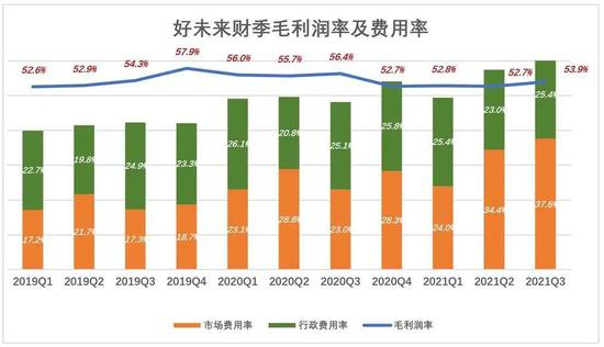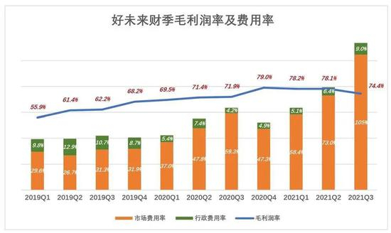 2021财年第二财季,市场/行政费用率合计达57.4%,同比提高将近8个百分点,第三财季,进一步提高到63%,同比提高近15个百分点!
