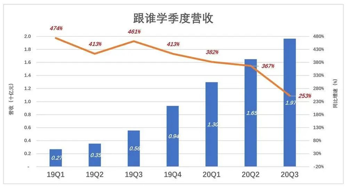 因为跟谁学市场费用原来就很低,2019年Q1市场费用同比增长6倍,经营利润率仍然达到15.9%。但市场费用巨幅增长对业绩的影响逐步显现:2020年前三季市场费用分别为7.6亿、12亿和20.6亿,同比增幅分别为661%、613%、522%!