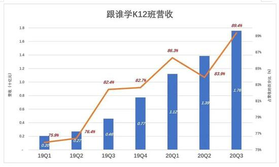 K12“大班双师”模式跑通后,成为带动整个公司营收增长的主引擎。2019年Q1,K12班收入刚刚突破2亿,占营收的76%;2020年Q3,K12班收入达17.6亿(过往6个季度,平均环比增速达到43%),占营收的89%。