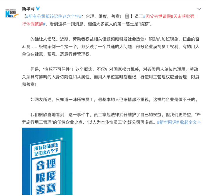 原标题:因父亲去世请假8天未获批强行休假被辞,这算矿工吗?官媒发声!